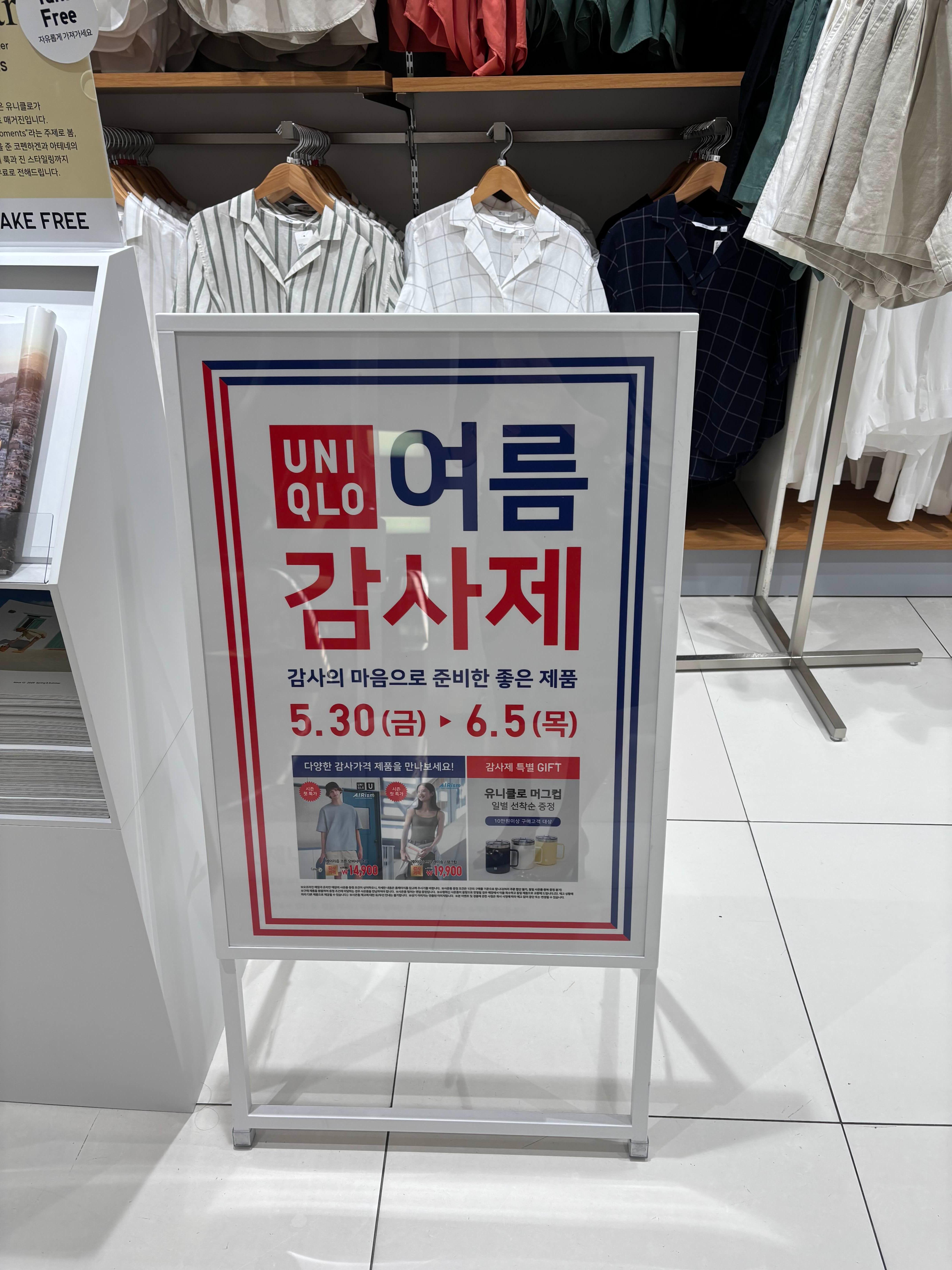 유니클로의 감사제(感謝祭 かんしゃさい) 매년 봄(5~6월)과 가을(11월)에 열리는 대규모 세일 행사로, 다양한 인기 상품을 특별 할인 가격에 판매하고, 사은품 증정 및 지역 한정 이벤트 등을 통해 고객에게 감사의 마음을 전하는 행사입니다.